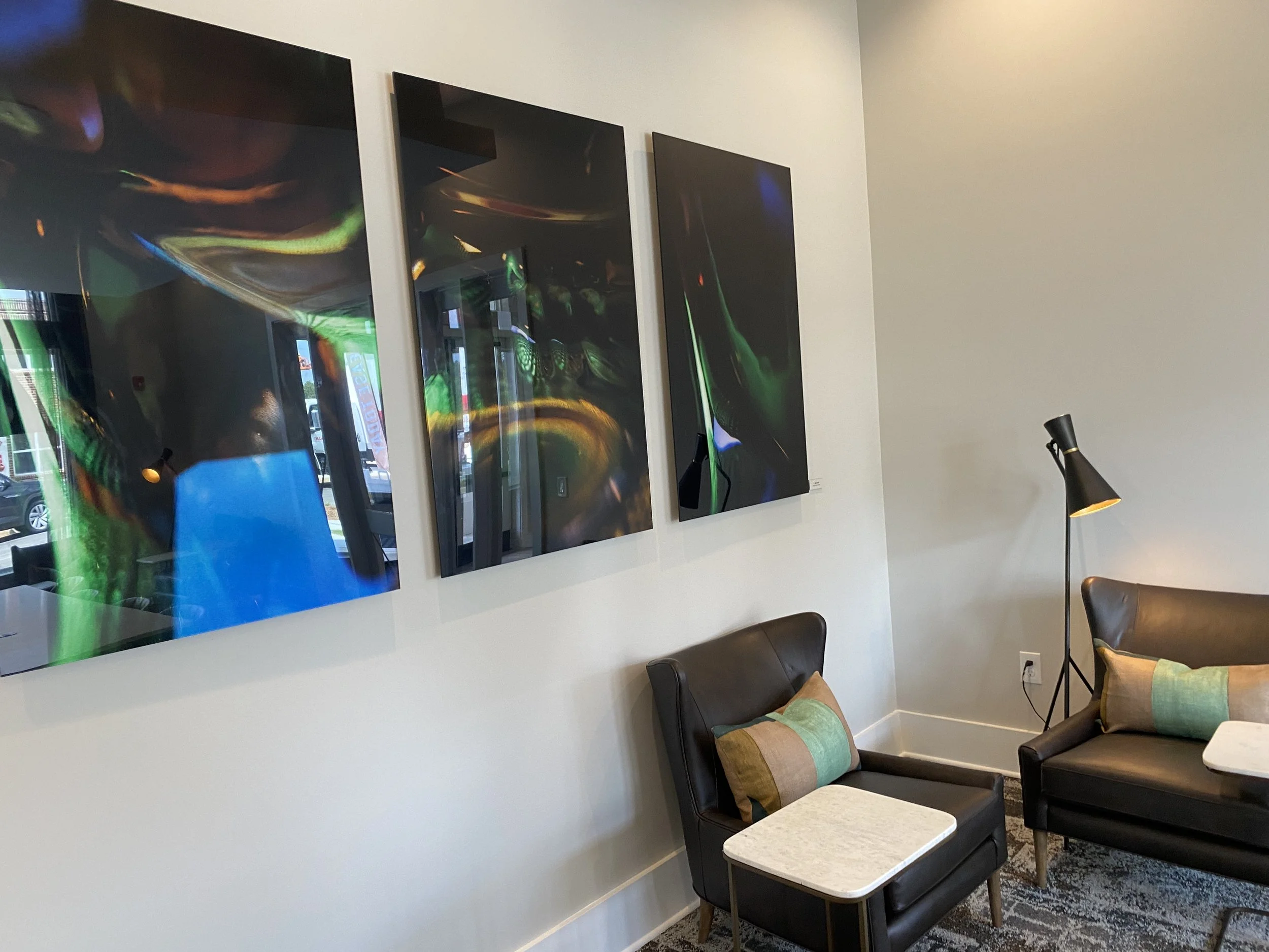 The new Allora Community on Moreland in trendy East Atlanta wanted to feature Atlanta artists while keeping an eye on a limited budget. Beautiful custom prints and a original mixed media work bring vitality and local interest to the community spaces.